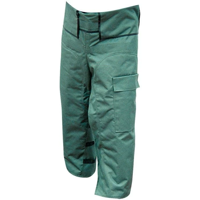 New Forester Apron Style Chain saw chaps. Protective leg garment is designed to reduce the risk of severity of injury to body parts covered by pads, should they come in contact with a rotating saw. Oil and water resistant oxford outer. Choose from Safety Green chaps featuring 2in wide reflective stripes, or from Forest Green or Safety Orange. All chaps include a side pocket. Wash by hand in cold water, hang dry. Length is measured from the waist, not the inseam.