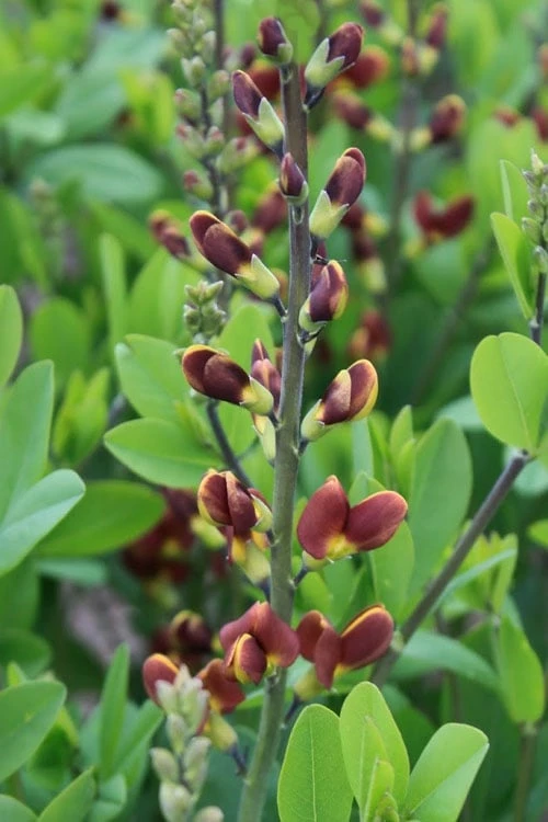 An unusually beautiful and unique flower color as well as densely branched foliage, and a very long-lived perennial that anyone can grow, ‘Cherries Jubilee’ is a fine selection in the superior Decadence Baptisia Series. From late spring to early summer, deep maroon buds open to bicolor maroon and yellow pea-like flowers that are held on strong scapes above the attractive blue-green foliage. Secondary branching on the flower stems makes this variety especially floriferous. Relatively short for a Baptisia (2.5 to 3′), the well-branched stems form a bushy, upright spreading mound making it a good candidate for the middle of the perennial flower border. After the flowers come ornamental seed pods that extend the season of interest into fall. Kids will love to shake and rattle the seed pods!