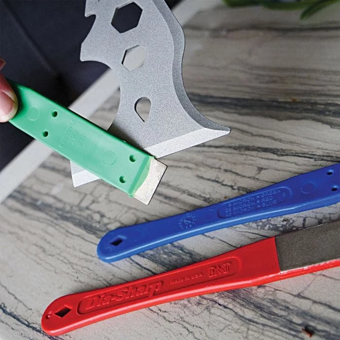 DMT introduces the new Dia-Sharp Mini-Hone featuring a super abrasive continuous surface made exclusively with monocrystalline diamond. Sharpens faster than traditional sharpeners. The kit includes three color coded grits in Green 9 – extra fine, Red 25 – fine and Blue 45 – coarse. Thin easy-access tip for use in tight corners and tough access areas, ergonomically designed ?hourglass’ shaped handle for superior comfort and control, and a lightweight convenient size with hang hole for pocket, tool hook, or tool boxes. Three great sharpeners, one price.