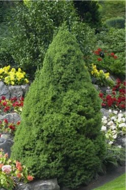 The perfect outdoor Christmas tree that never needs pruning, Dwarf Alberta Spruce is a truly miniature slow-growing evergreen conifer prized for its natural, formal pyramidal form and small stature; slowly reaching 6 to 8 feet high by 3 feet or so wide at maturity. Excellent in pots and garden beds!