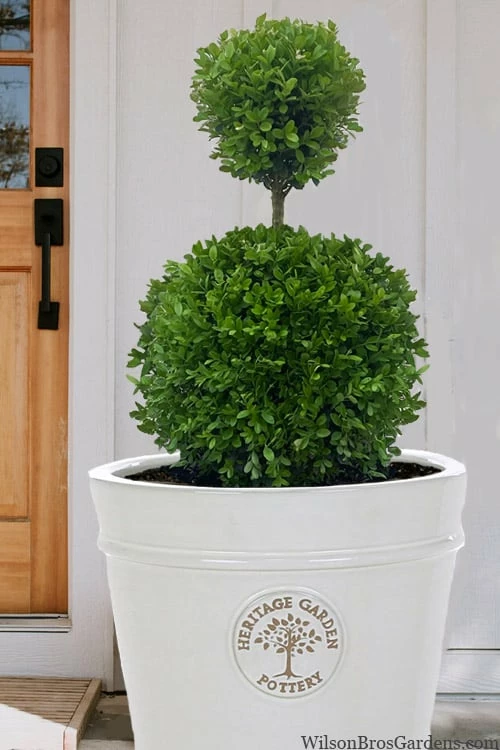 Unrivaled in its beauty among boxwoods, the Dwarf English Boxwood, Buxus sempervirens ‘Suffruticosa’, has been the most extensively planted boxwood in the United States over the past century. This is the two-ball poodle tier topiary version. Its small, glossy evergreen leaves provide a fine and delicate texture in the landscape. A slow-grower, it will rarely require pruning, maybe a light trim once a year in mid spring. Unlike many other boxwoods that prefer full sun, you might be happy to know that the Dwarf English Boxwood prefers part shade and will even tolerate mostly shade. We suggest some filtered sun or shade during the midafternoon hours. Excellent in garden beds or pots that can be situated on patios, decks porches and around other outdoor living spaces.