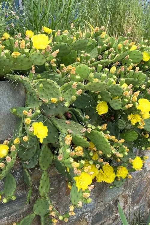 Growing to around 2 feet tall and 5 or more feet wide over time, the Eastern Prickly Pear Cactus is ideal for use as a specimen or groundcover in sunny landscape borders and gardens beds. Also great for spilling over walls. Can also we grown in pots that can be situated outdoors or indoors, just make sure to provide at least 6 hours of bright light or more per day in an interior environment. A fine addition to rock gardens and the Xeriscape Gardens (low water needs when established). We like combining Prickly Pear with other low water need plants such as yucca, junipers, barberry, abelia, ornamental grasses, loropetalum and other succulent plants to name a few.