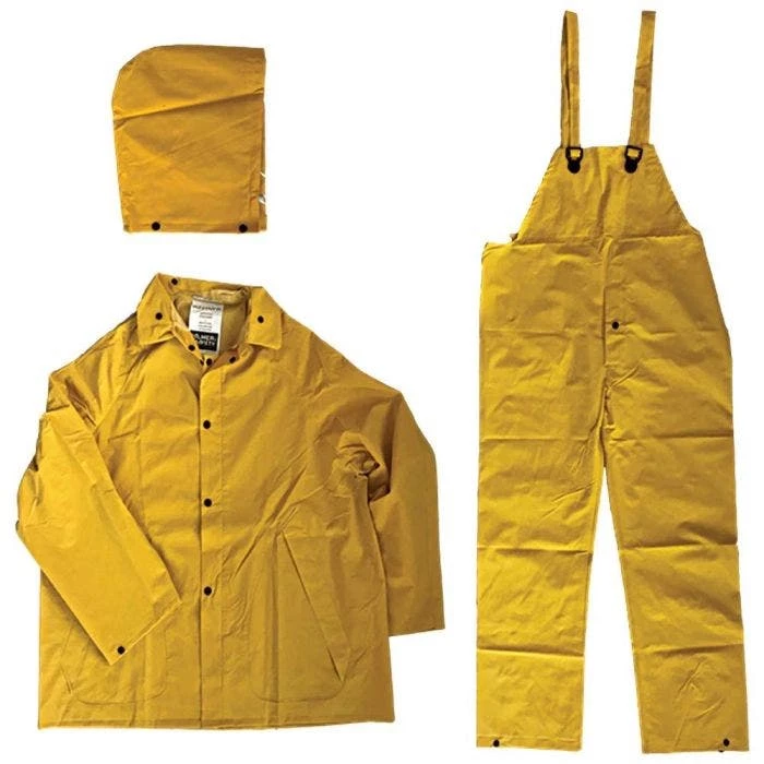 These two-piece yellow rain suits have a 1/3 mm PVC on polyester design. The suit top has raglan-style sleeves, a caped back, and vented underarms. You can snap the hood on and off as desired. The bib-style trousers attach via adjustable suspenders. Each Economy Rain Suit includes take-up snaps on the sleeves, ankles, and waist. These suits feature electronically-sealed seams and non-conductive buckles and snaps. Choose your desired size below. This rainwear keeps you comfortable and dry. The take-ups on the sleeves, ankles, and waist prevent water from seeping in. You stay cool thanks to the caped back and vented underarms. Two side-entry pockets also keep your phone or small tools out of the rain. Economy Rain Suits combine durability, comfort, and value. Their PVC on polyester design offers strength without adding weight. Sizes 3XL through 6XL are special order items. Please allow additional time for processing and delivery.