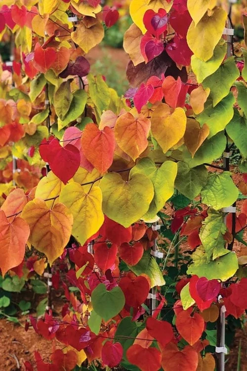 A magnificent flowering tree that deserves a spot in every landscape where it will grow, the Flamethrower Redbud is one of those trees that the minute you see it you just have to have one. As with other redbuds, this one begins the season in late winter with its stems smothered in bright purple sweet pea-like flowers. As the flower show comes to a close the even more spectacular foliage show begins. The heart-shaped leaves emerge burgundy-red quickly turning to red, orange, yellow and then lime green. What’s truly stunning is how all these colors are present on the tree at the same time during spring! With the arrival of cooler temperatures in fall the foliage turns to yellow. At 15 to 20 feet tall and 12 to 15 feet wide, Flamethrower is a perfect fit for both small or large landscapes.
