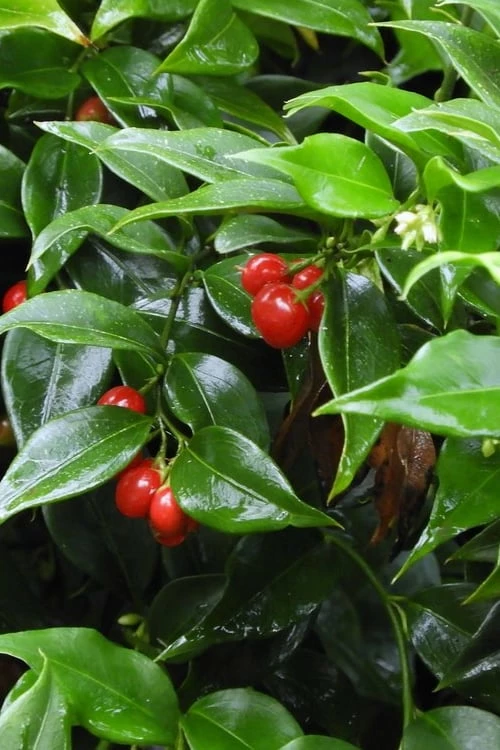 A beautiful and fragrant evergreen flowering shrub for shady areas, Sarcococca ruscifolia, commonly called Fragrant Sweet Box, is adored for its highly fragrant dainty white flowers that come in abundance during the dead of winter, when they open to release their delightful sweet vanilla perfume. Following the flowers are attractive red berries that turn black over the summer. A compact shrub that typically grows 3 to 4 feet tall and wide tall and clothed in glossy deep green pointed leaves, this year round evergreen and cool season charmer thrives in shade and tolerates dry shade once it is established.