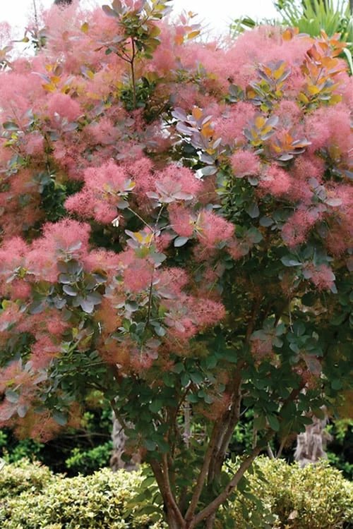 A moderate grower with a broad and rounded form, the Grace Smoke Tree will eventually top out at about 15 feet, making it a great choice for a number of planting options throughout the landscape or garden. It can be grown as a large shrub or lower branches can be removed to form a very attractive small tree. Because of its uniqueness, we usually suggest using it as a focal point specimen in the landscape, as we do with Japanese Maples. That said, Grace is also nice in groupings or or plant one on either side to accentuate an entryway. A fine addition to rock gardens and the Xeriscape (low water needs).