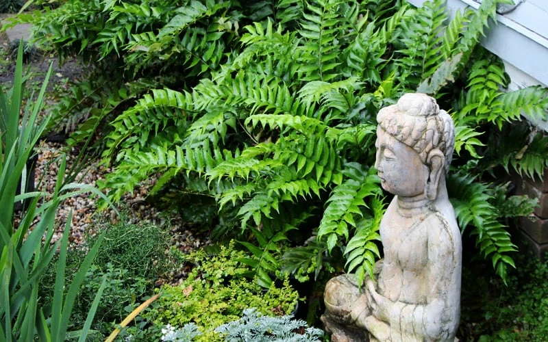 Growing 18 to 24 inches tall and wide, in zones where it is evergreen, the Japanese Holly Fern is ideal for use as a groundcover in shady areas, providing a lush, tropical effect. Use it as a specimen or in small groupings in small garden spaces. Adds great texture to container plantings. Those of you above USDA Zone 7a, where this fern in not reliably winter hardy, can grow it in containers that can be overwintered indoors. Tolerance for dry air qualifies this plant for use as a houseplant.