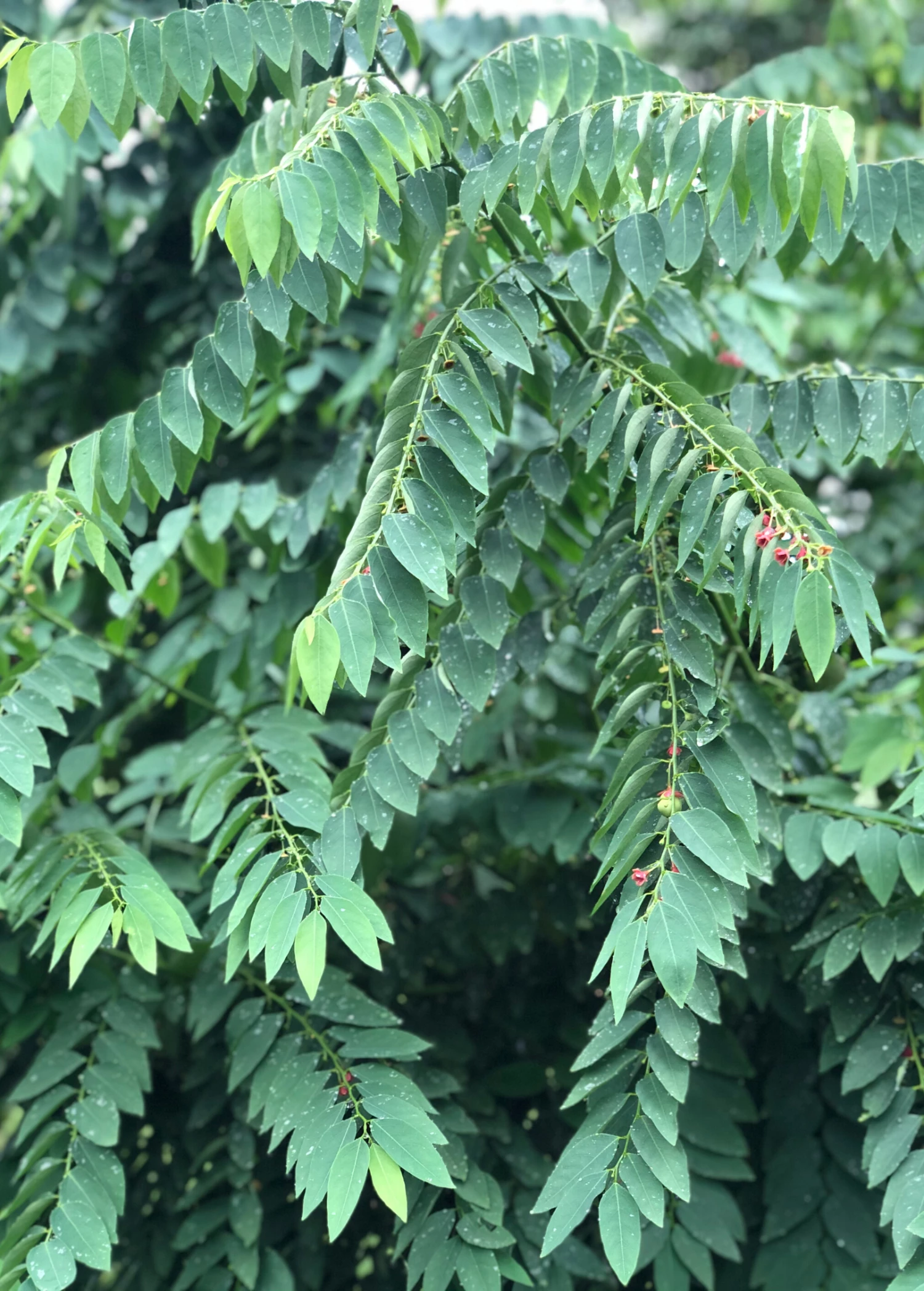 Katuk, Star Gooseberry, Sweetleaf, or Tropical Asparagus, is a multi-stemmed, evergreen shrub native to India, Southeast Asia, Malaysia, and the Philippines. It grows up to 8 feet tall with dark green leaves growing along its long, pendant branches. White male and red female flowers bloom in the leaf axils during the summer and fall, forming purple fruits with small black seeds. All parts of this beautiful shrub are edible and cultivated as a high-yield crop.