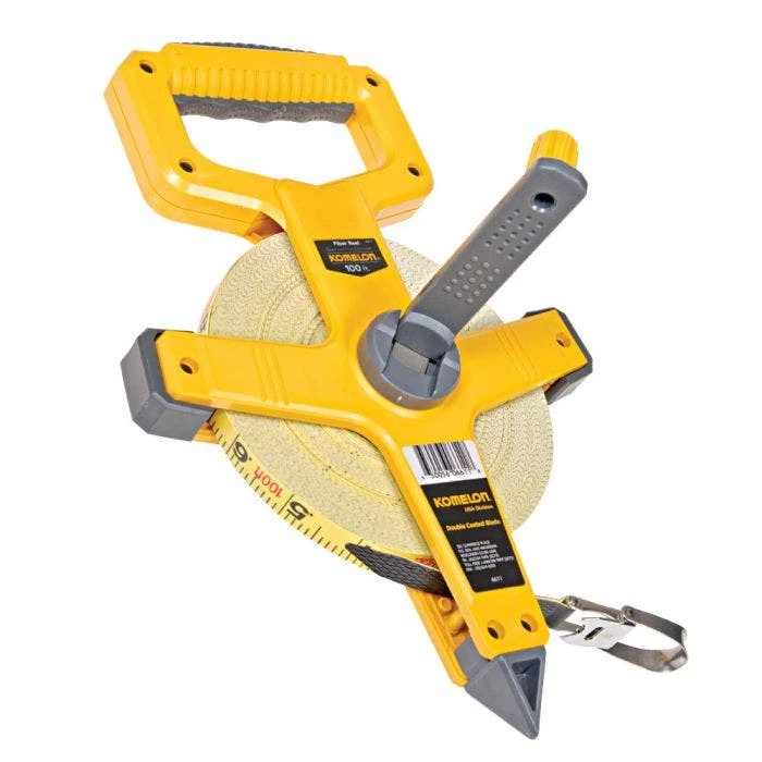 Komelon Open Reel Fiberglass Tape is a measuring tool that is perfect for any long measuring needs. It features a double coated fiberglass blade, a durable ABS frame, and a rubber handle grip. Its hook end and claw adds to its versatility, making it an essential tool for any measuring project.