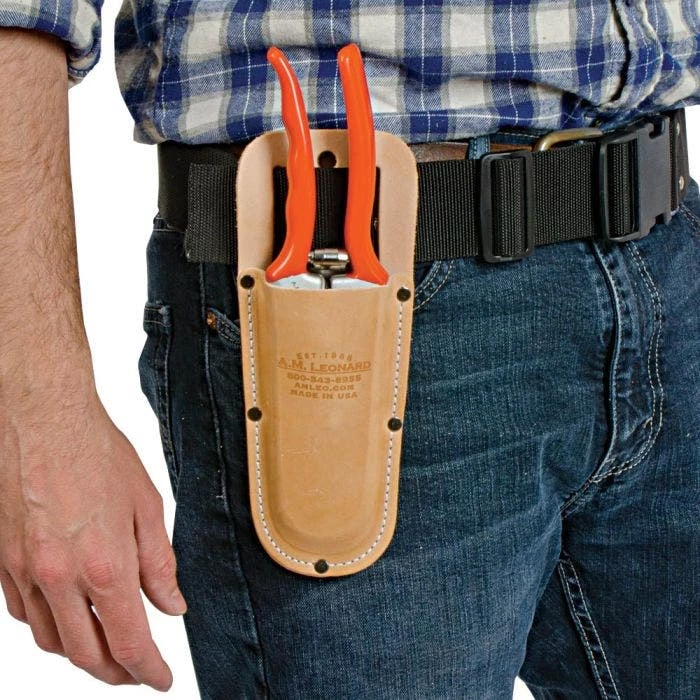 The case is designed to fit most pruners and shears up to 8 inches in length. The high-quality leather provides added durability and protection for the pruners when not in use. It also has a built-in belt slot and a metal clip for attaching it to the included Leonard Web Belt.