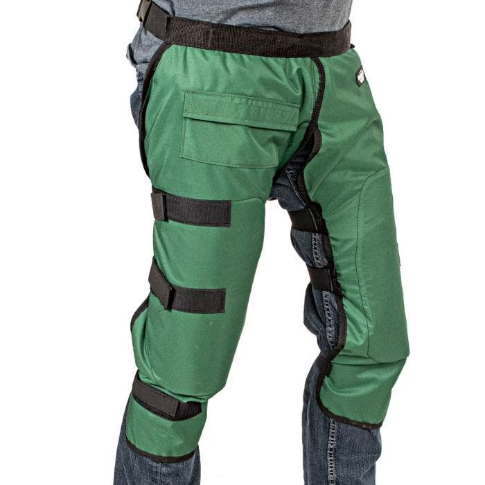 Leonard Premium Hedge Trimmer Chaps have a shorter, one-piece design. We make them We outfit these chaps with a quick-release snap buckle on the belt. Stretchable straps with hook & loop fasteners attach around your legs for a perfect fit. Our premium chaps feature an open back, a breathable outside layer, and drilled interior thigh panels.