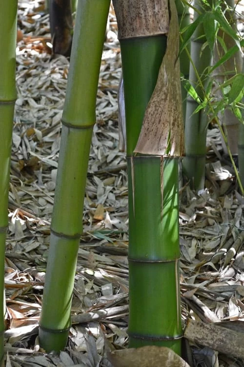 Giant Japanese Timber Bamboo is a running bamboo, which means it spreads. Bamboo can be controlled in a small area (a normal city yard) simply by mowing or stepping on the young shoots. New shoots of this bamboo can also be used for culinary purposes and cooked, much like asparagus. Keep in mind that running bamboo only puts up new shoots for a short time each year and, when they are “shooting,” the new plants are very fragile and easy to destroy. Root pruning or installing Bamboo Root Barrier are other methods to control spread.