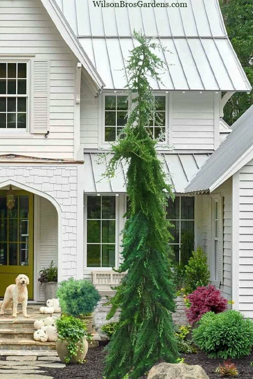 An attractive focal point that puts a tall exclamation point on the landscape, and sure to be a conversation piece, the ‘Miles High’ Weeping Deodar Cedar is an excellent evergreen for adding height to the landscape. It’s narrow, weeping, columnar form allows it to fit in smaller spaces where its much larger growing cousins won’t fit. A moderate grower that might reach 10 to 12 feet tall and 3 feet wide in 10 years, and upwards of 30 feet tall and 6 to 10 feet over the long term, it has a tall central leader and graceful weeping branches covered with attractive greyish blue-green needles. Though it grows upright, it might have a little twist here and there and an occasional occasional arm that reaches out to to demonstrate its individuality from the rest of the tree. A real show stopper!