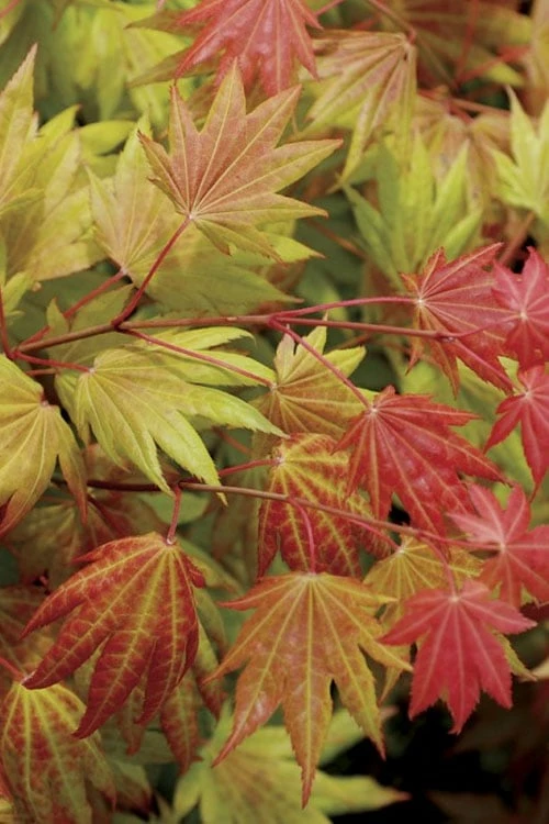 Acer shirasawanum ‘Moonrise’ is a relatively new and exciting Full Moon Japanese maple cultivar that is sure to delight the eye with spectacular changing colors throughout the season. In spring, new leaves emerge bright red changing over to brilliant chartreuse with orange tones during summer. Fall brings glorious shades of orange and red. This one has shown good resistance to leaf burn when growing in the sun. That said, we think Japanese maples look more at home in a spot where there’s some filtered sun or shade in the afternoon. A somewhat slower grower to 10 to 12 feet tall and 6 to 8 feet wide, this luminous small tree is excellent for use in pots and smaller garden spaces as a focal point specimen that is sure to light up the landscape!
