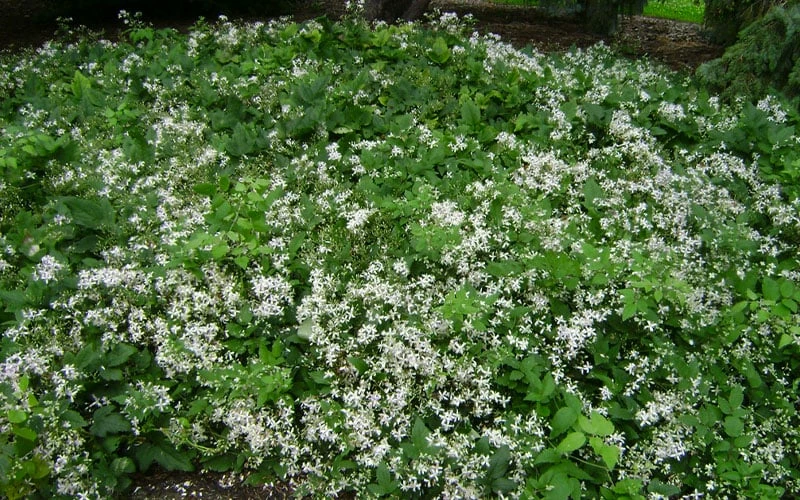 An oldie-but-goodie discovered as a chance seedling in Cleveland, Ohio sometime in the 1930’s, from mid summer through early fall the Mrs. Robert Brydon Clematis features masses of starry, cute little soft-lavender flowers with recurved petals surrounding a prominent patch of soft-yellow stamens that radiate in all directions. Sure to brighten up any area, we suggest planting against a dark backdrop where her flowers will truly sparkle in the garden. A vigorous grower clothed in attractive deep green foliage, she is excellent as a climber to 8 feet tall on a trellis, or as a sprawling groundcover reaching 2 feet tall or so and 6 to 8 feet wide. Let her sprawl over a fence or rocks or just over the ground for a great show at a time of year when not a lot of other plants are in full bloom.