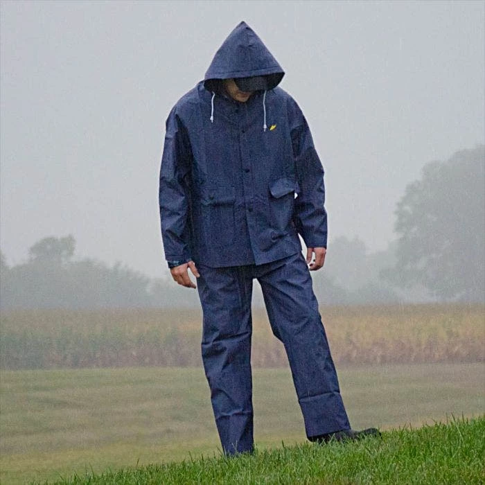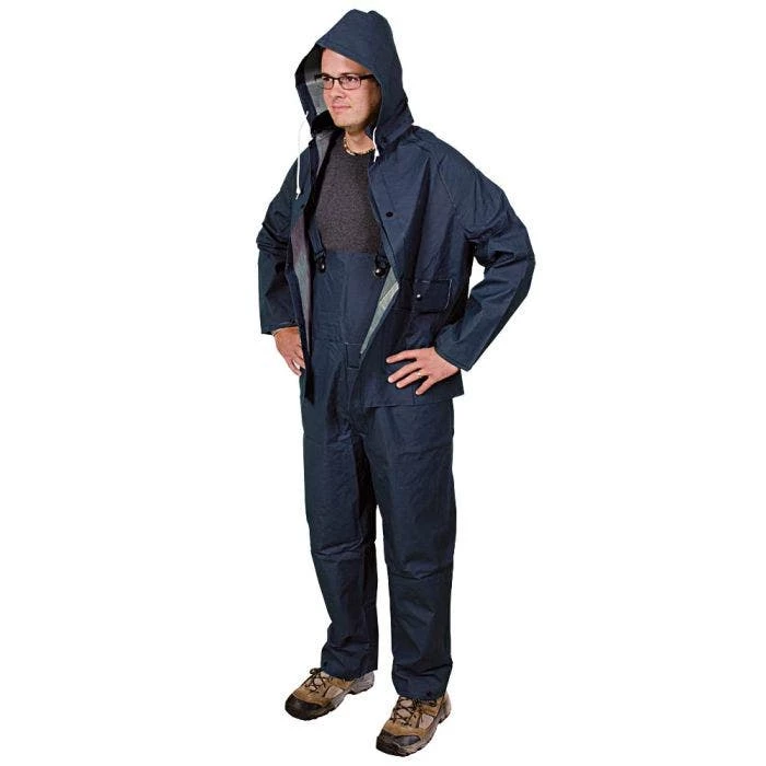 High quality PVC on polyester for effective yet affordable waterproof protection. Complete three-piece protection, with jacket, hood and trousers in .35mm. Sitex. Features include adjustable waist snaps, 2 front snap pockets, cape back with nylon vent, ankle take ups and underarm vents. Sizes: M, L, and XL. 76599 – Blue