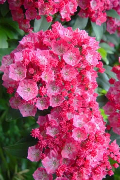 The ‘Pink Charm’ Mountain Laurel features abundant large clusters of deep pink star-shaped buds that open to cup-like, pentagon-shape, bright pink flowers with a white eye that is surrounded by a deep rose-pink ring near the base of the corolla. Pink Charm forms an upright natural looking shrub clothed in attractive glossy dark green leaves that are an excellent backdrop to showcase the flowers. This gorgeous North American native is perfect as a specimen in shady garden beds, home foundation plantings, or in a grouping along a shady woodland border.