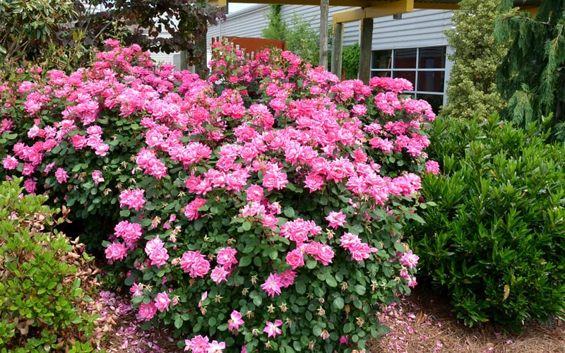 Growing 4 to 5 feet tall and wide, the Pink Double Knock Out Rose is ideal for use as a specimen, in groupings or as a colorful hedge in landscape and flowering shrub borders and home foundation plantings. This rose is so reliable and attractive throughout the season we have no problem suggesting it for use in home foundation plantings. A fine addition to rose gardens, cottage gardens and pink theme gardens.