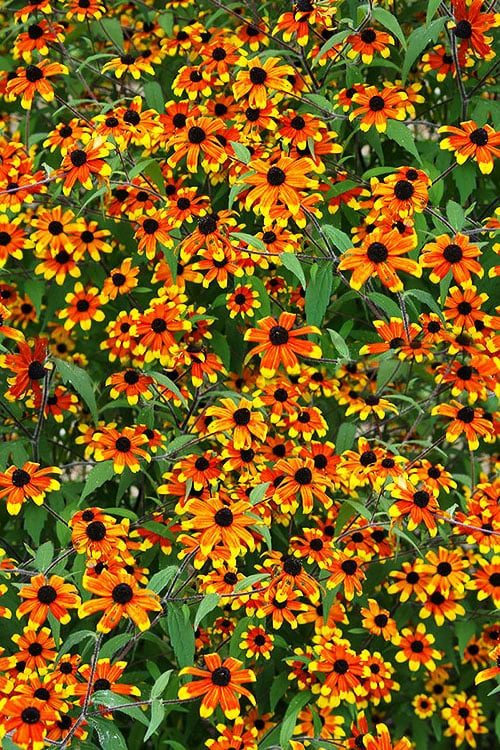 If you’re in to the natural, wildflower look, and like plants with a long bloom period, Rudbeckia triloba ‘Prairie Glow’, commonly known as the Brown Eyed Susan, is a must-have North American native biennial plant that will freely naturalize along sunny woodland borders or in meadow or wildflower gardens. From mid summer to mid fall this flower factory produces LOADS of cute bicolor coneflowers with petals in shades of orange to red tipped in golden-yellow surrounding a contrasting, deep brown to black center cone. Expect to see many variations of the color shades on the plant at the same time. The butterflies and other beneficial pollinators are sure to appreciate the late season flowers. The leaves of this species are thinner than other Rudbeckia, some being 3-lobed, hence the species name. If you’re using it it a natural area, make sure to leave some spent flowers on the plant in the late season for the birds, and for self-seeding that will result in more and more plants every year that goes by.