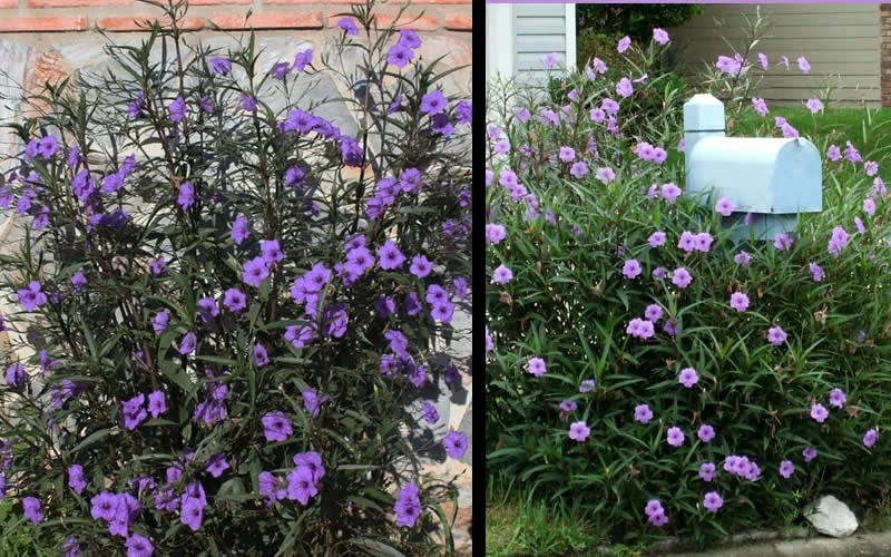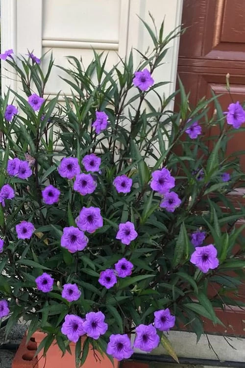 ‘Purple Showers’ Mexican Petunia, which is a Ruellia and not a Petunia, is a very versatile and easy-to-grow hardy perennial in USDA Zones 8a-11. In zones north of 8a it can be grown as an annual in flower beds or in containers that can be overwintered indoors. The plant forms attractive clumps of erect, deep purplish stems that are clothed in dark-green, willow-like leaves tinged in purple. Vibrant purple petunia-flowers 2 inches in diameter are produced in abundance continually from late spring through fall – year round in zones where it remains evergreen. Butterflies and hummingbirds will flock to the flowers all season long!