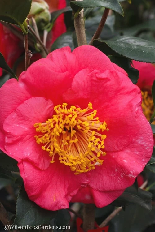 The large, dazzling flowers of R. L. Wheeler Camellia Japonica are deep-pink with random white markings and bright yellow stamens at the center that are sometimes prominent and sometimes only peak out from the petals. The glossy, deep-green leaves provide a wonderful contrast and backdrop for the brightly colored flowers.