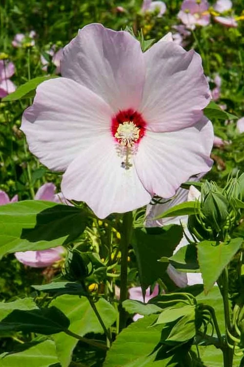 If you’re looking for a super hardy flowering perennial shrub to grow in a sunny spot that stays moist to wet all the time, Hibiscus moscheutos, commonly known as Hardy Hibiscus or Swamp Rose Mallow, is a vigorous and foriferous North American native that loves life on the moist side…and it’s cold hardy to -20F! In summer, very showy, dinner plate-sized flowers 6-9” in diameter have five overlapping white, creamy white or pink petals surrounding a reddish-purple to dark crimson eye. Each flower has a prominent, elongated central stamen with white to soft yellow anthers. Individual flowers last 1-2 days, but new flowers open each day in rapid succession throughout summer well into fall. At the peak of bloom, a large plant can produce 20 or more flowers per day that the hummingbirds and butterflies will certainly appreciate. Alternate, broad-leaves with toothed margins provide a tropical effect in garden.