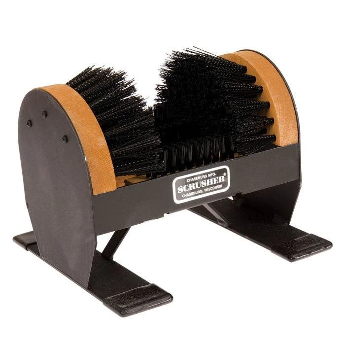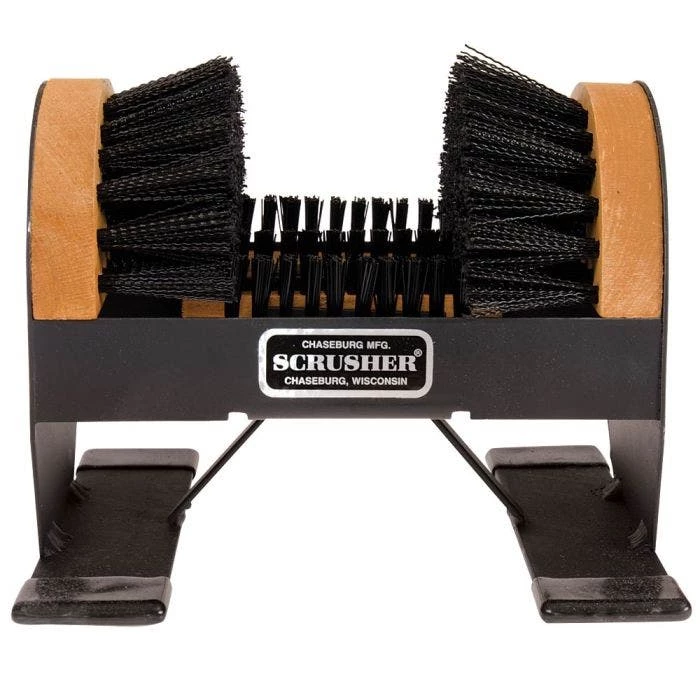 Sturdy steel and solid maple, with stiff poly bristles to clean sides and bottoms of footwear quickly. Can be permanently mounted to heavy duty rubber mat, wood or concrete.
