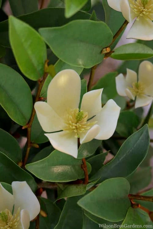 ‘Serendipidty’ is a new and improved Banana Shrub with larger flowers and a much heavier bloom than the original species. You’ll definitely see the flowers on this one! We also hear that ‘Serendipity’ might be even more cold hardy. For 3 to 4 weeks in spring the abundant, fragrant, creamy white flowers come all at once aging to butter-yellow and smelling like a banana popsicle, hence the common name. Growing upwards of 15 feet in height, this one naturally forms a large and rounded evergreen shrub, or lower branches can be removed to form a very attractive small tree. The oblong, glossy, evergreen, green leaves are attractive year round and serve as the perfect backdrop to the numerous flowers. Though originally from China, this magnificent plant is one of the classic evergreens of the Old South.