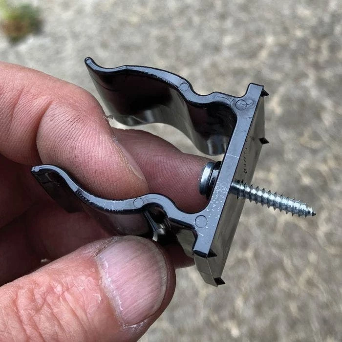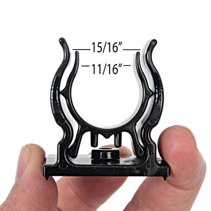 The same heavy duty composite tool clips now available in a wall mountable version. Quickly and easily organize your workshop or tool shed. These UV-treated tool clips fit nearly all professional-grade long-handled and D-grip tools. Use to hang or store any object with a diameter of 7/8 to 1-5/8 inches. These simple, low profile clips will help make the most out of any storage space. *Sold in packs of 6 clips with two inner clips for smaller diameter handles. This versatile clip includes an insert for smaller diameter handles. Multi-purpose philips head fasteners are provided . Ship wt. 0.8lb.