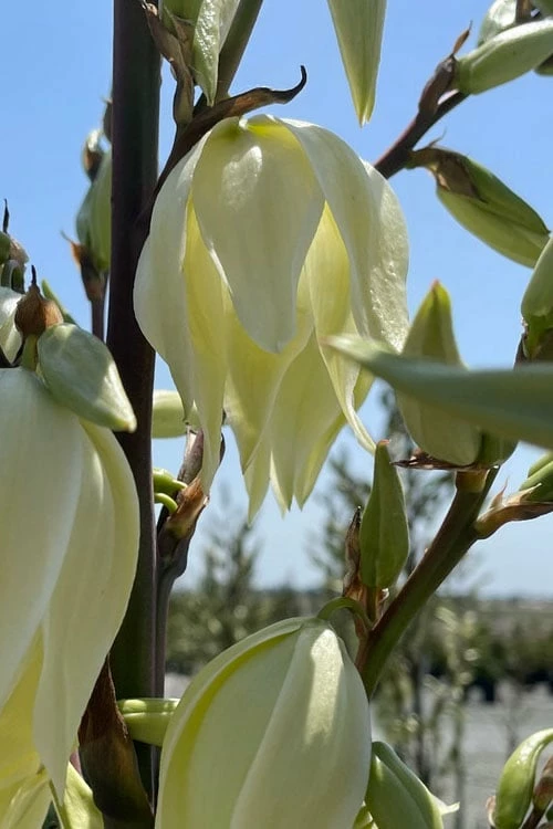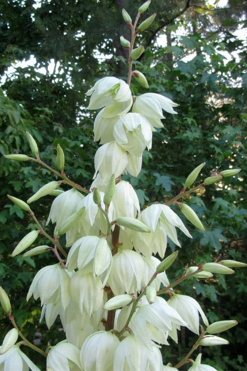 Truly unique and beautiful, the Silver Anniversary Yucca is an outstanding and very easy to grow architectural plant in the landscape. A cross of Yucca filamentosa and Yucca pallida, Silver Anniversary will quickly form a clump of dusty-blue, sword-shaped leaves to 2 feet tall and 4 feet wide. In late spring to early summer tall burgundy stalks rising to 7 feet high are topped with a large tower of bell-shaped white flowers. A site to behold! Silver Anniversary grows well in most any type of soil provided it is well-drained and full sun to part shade. As with other Yucca, it has high drought tolerance and the deer turn their nose up to it.
