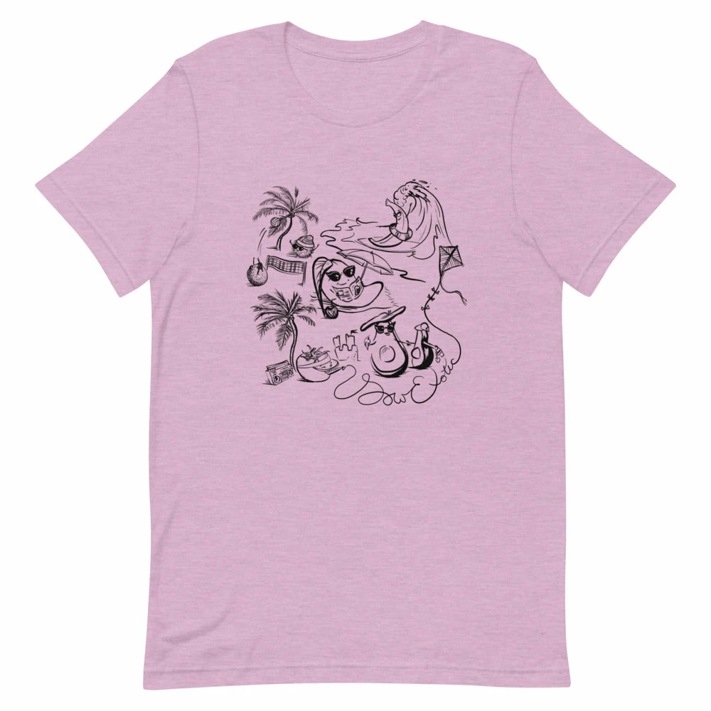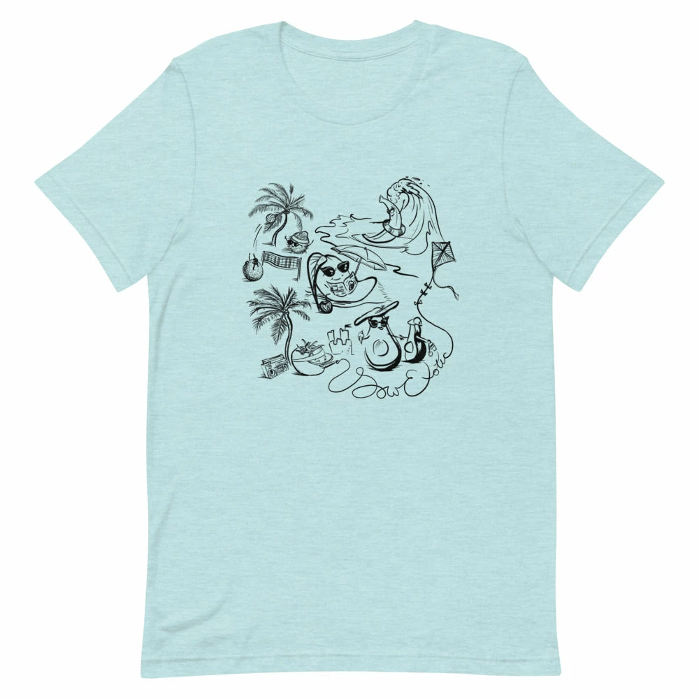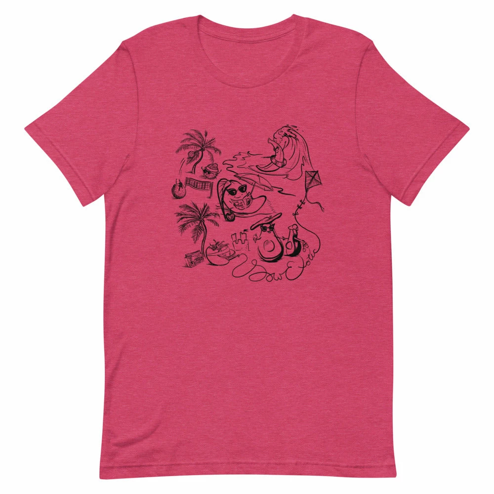 Our Summer 2021 print features a surfing banana, sun tanning mango, frolicking family of avocados, kite flying tomato, and a friendly game of volleyball between a lychee and top-bun-toting rambutan. We designed this unique print for our first ever seasonal t-shirt and it was hand-drawn by Sow Exotic’s very own June Bunch!