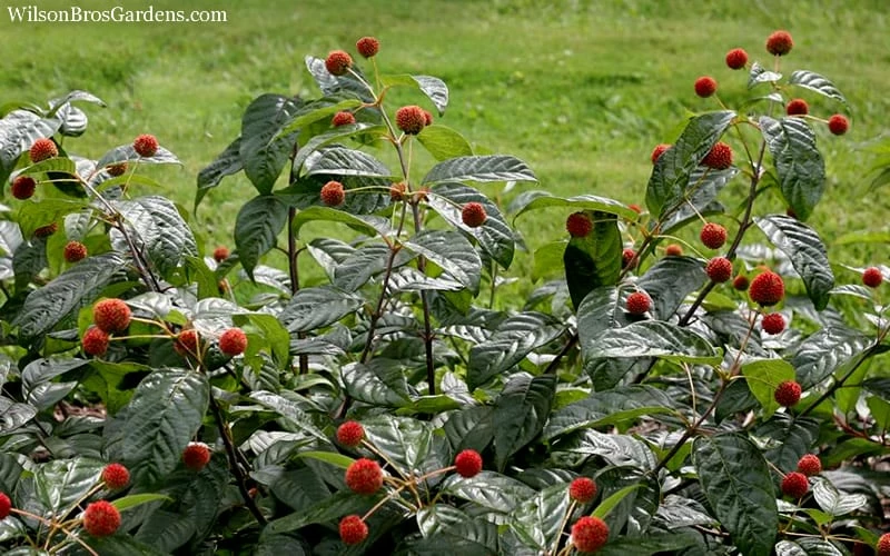 A North American native flowering shrub that anyone can grow, almost anywhere in the continental United States (USDA Zones 4a-10b), buttonbush has long been prized by American gardeners but its size was just too big for many gardeners landscapes. That has changed with the arrival of ‘Sugar Shack’, a new dwarf Cephalanthus cultivar that grows to only half the size of the original. Sugar Shack produces the same unique flowers that look like white gumballs surrounded with with fiber optic wires, which might make one wonder if there was extraterrestrial involvement in its breeding… or if it shot down to Earth from outer space to plant itself in a new world:-) Add in glossy leaves and red fruits that follow the fragrant flowers and you’ve got a fascinating plant that captivates but a human audience and butterflies, hummingbirds, other pollinators and other birds from spring through fall!