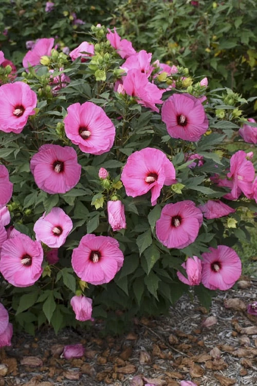 If you like the color pink, you’re going to love Summerific Candy Crush, a super hardy Hibiscus (Rose mallow) that both northern and southern gardeners can grow outdoors year round with cold hardiness down to -30F as far north as USDA Zone 4a. A long-blooming perennial, from mid summer to early fall Candy Crush produces abundant buds opening to very large 8″ diameter flowers with bubblegum pink petals surrounding a near-black, dark red eye from which protrudes a long, pink-tipped white stamen. The magnificent flowers stand out beautifully against the rich green foliage on cloud-shaped plants 4 to 5 feet tall and equally as wide. Not only you will enjoy this marvelous plant as a tropical flare in the garden, your butterflies and hummingbirds will thank you for including it. Excellent near patios, decks and around other outdoor sitting areas and living spaces.