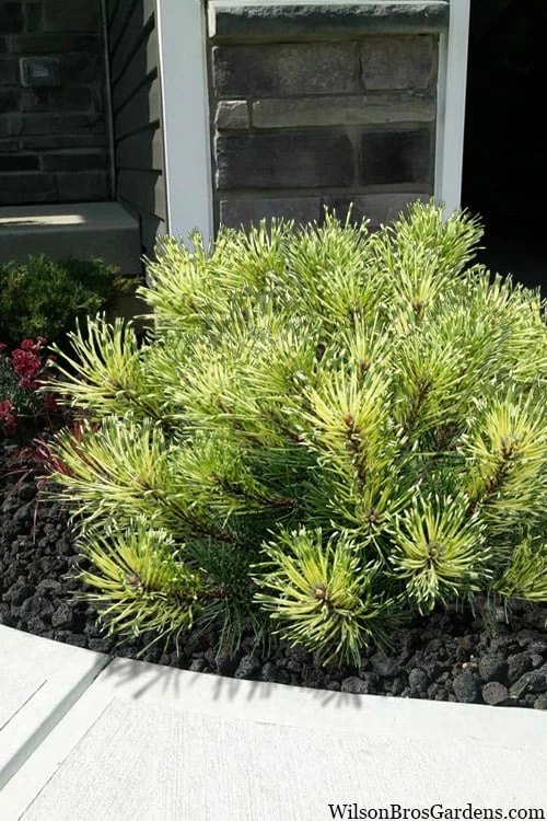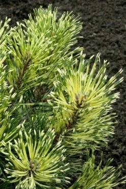 A rare and showy gem discovered and introduced by Wiel Linnsen of Libo Nursery in the Netherlands, the Sunshine Mugo Pine is a variegated selection sporting whorls of emerald green needles with prominent yellow bands similar to dragon eye pines. The variegation is most intense during spring but holds well and is sunburn resistant through the seasons. Fairly vigorous for a mugo pine, you can expect Sunshine to reach maybe 2 to 3 feet in height and width in 10 years with no pruning. That said, the vertical “candles” that emerge at the tips of every stem, which become the new branches, can be pruned by up to 50 percent of their length to maintain a smaller, more dense shrub. You’ll find detailed but simple Mugo Pine pruning tips here. Providing very unique color, texture and form in the landscape, Sunshine Mugo Pine is an excellent accent or grouping in rock gardens, home foundation plantings and landscape borders, and is the perfect compliment to ornamental grasses and Japanese maples and other small trees.