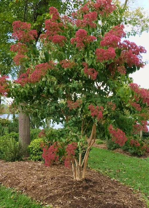 With its 4-season appeal, this underused, easy-to-grow 8 to 10 feet tall small tree is sure to bring a stunning addition to any landscape in USA Zones 5 through 9, which covers most of the United States. In spring, attractive, deeply veined green leaves emerge that are twisted on the tips. Following in mid to late summer, when we need color in the landscape, are numerous clusters of fragrant white flowers the butterflies and hummingbirds will thank you for. The flowers are then replaced with striking, cherry-red bracts that persist though fall. Attractive, peeling tan bark provides winter interest. A truly outstanding tree that deserves a spot in every landscape where it will grow!