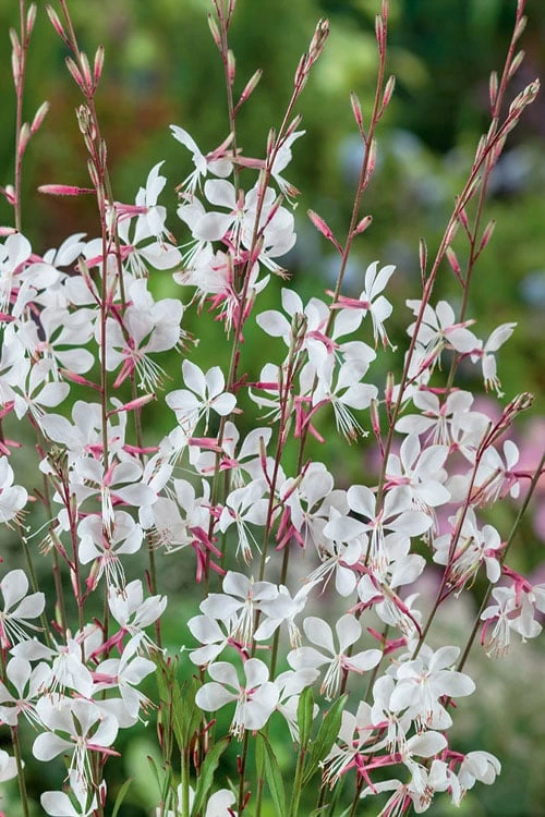 More compact and floriferous than the species, the Whirling Butterflies Gaura, commonly called Wandflower by some folks, is a very hardy and easy-to-grow native perennial featuring arching red stems and pink buds that open to butterfly-shaped snow-white flowers, and butterflies love them! So do the hummingbirds and other beneficial pollinators. Flowers open on long, wand-like panicles over a long period from late spring to early or mid fall, dancing in the wind like butterflies, hence the cultivar name. Clothed in narrow lance-shaped leaves, at 2 to 3 feet tall and equally wide Whirling Butterflies is a good fit as an accent in small garden spaces and container gardens or grouping in larger borders. Very easy to grow, this plant can take the cold (-20F) and heat, blazing sun, and is drought tolerant when established. You might also be happy to know that Gaura is not on the deer or rabbit menu.