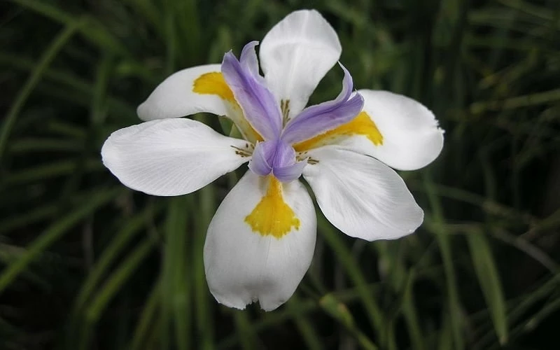 African Iris, called by some the Fortnight Lily, is an evergreen perennial with spreading fans of stiff, leathery sword shaped leaves up to 2 feet tall but less than 1 inch wide. Pretty, stunningly white, iris-like 3-inch flowers accented with yellow and blue are borne in abundance atop 2-4 feet tall stalks that rise above the upright clumps of foliage. in tall stalks that reach from to to 4 feet tall. The flowers are absolutely beautiful. Like daylilies, they only last a day but are borne in profusion throughout the spring and summer seasons. They usually come in waves, with a fortnight (two weeks) of rest between cycles.